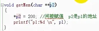 3.上一点中的p1和p2变量的数据类型分别为 char* 和 char** , 即,如果要在函数中传入实参,则形参的定义方法需要指定如上的数据类型,如图: